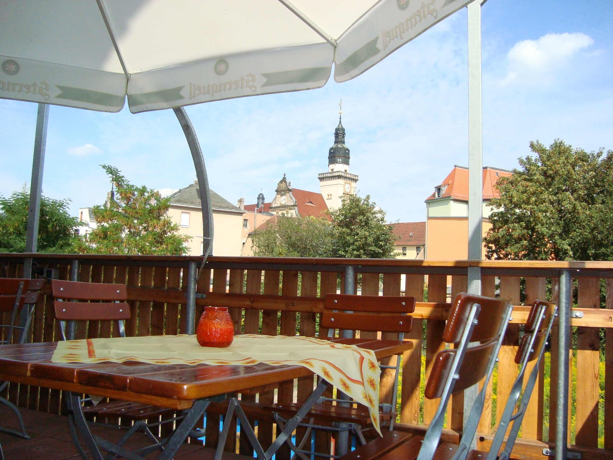Hier können Sie ein frisch gezapftes Bier und die Köstlichkeiten der Küche mit Blick auf das Werdauer Rathaus genießen |